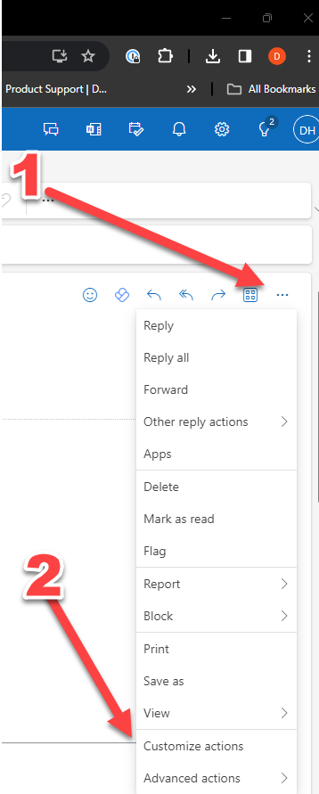 2. On the far right of the e-mail, there are three dots. Click on them, and at the bottom click "customize Actions"