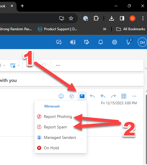 4. Next, hit the new Mimecast button on the right side of the email, and then click Report Phishing, or Report Spam. If it's trying to get you to click on something, it's Phishing.