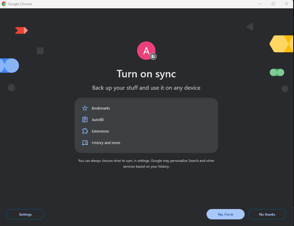 - Turn on Sync by selecting Yes, I'm in at the bottom right.